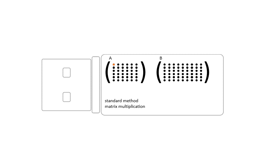 While the standard way of processing a matrix multiplication A * B = C is to calculate the elements of the resulting matrix C one after another, this patent pending approach groups all multiplications per element of Matrix B (or A respectively, as the info graphic is showing). In such processing pipeline, each sequentially incoming non-zero element of Matrix B (or A in the graphic) creates several dependent calculations. An incoming zero element of B (graphic: A) is dropped.